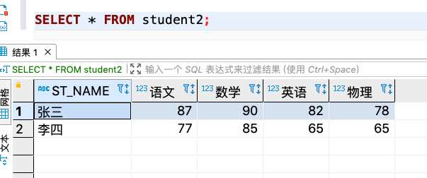 CREATE TABLE student2(st_name varchar2(30), "语文" number, "数学" number, "英语" number, "物理" number);INSERT INTO student2 (st_name,"语文","数学","英语","物理")VALUES('张三',87,90,82,78);INSERT INTO student2 (st_name,"语文","数学","英语","物理")VALUES('李四',77,85,65,65);