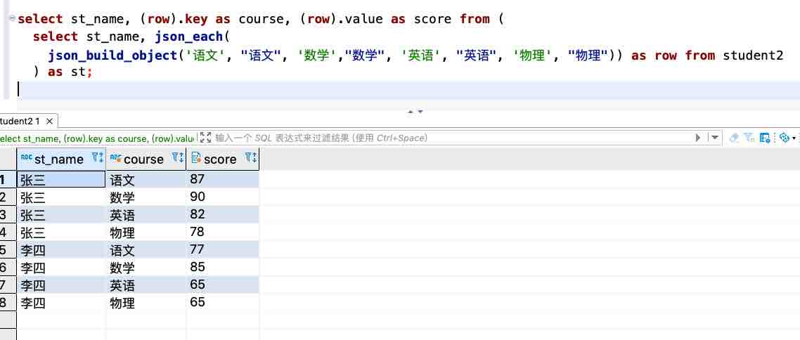 select st_name, (row).key as course, (row).value as score from (select st_name, json_each(json_build_object('语文', "语文", '数学',"数学", '英语', "英语", '物理', "物理")) as row from student2) as st;